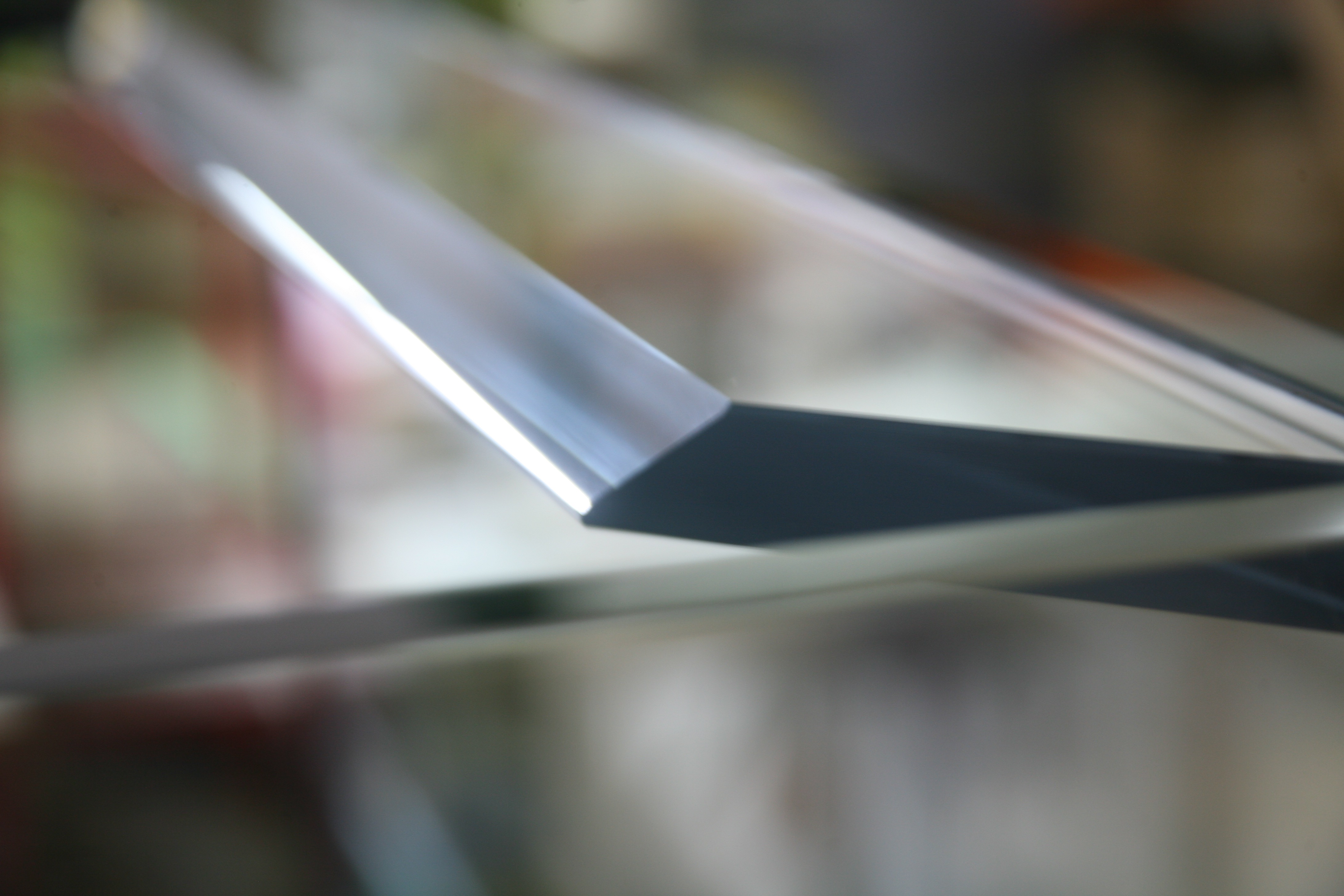 45˚ nicht weil es bei der Entstehung heiß her ging – das sicherlich auch – sondern weil sämtliche Scheiben auf Gehrung geschnitten und alle Kanten im 45-Grad Winkel geschliffen wurden. So auch die rundum gefertigten und plan verklebten Stege, welche zusätzlich im 45-Grad Winkel zum Aquarieninneren hin abgeschrägt wurden. Alle Kanten wurden zudem sorgfältigst poliert, sodass eine diamantgleiche Transparenz entstand.
